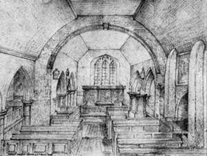 "Fragments of the stonework of the north aisle are to be seen in many places, especially in the garden at the Vicarage. They are much broken and defaced, but enough remains to show that there was at least one Romanesque pillar with boldly moulded capital and base."